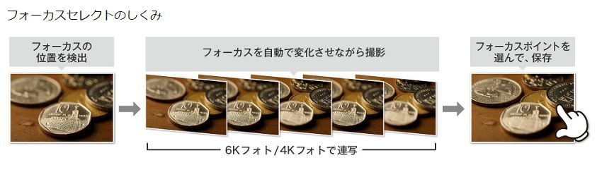 もう1つの6K PHOTOと4K PHOTOは、秒あたり30コマあるいは60コマという動画と同等な連写によって得られたデータから、自分の好きな1コマを取り出せる技術だ。
